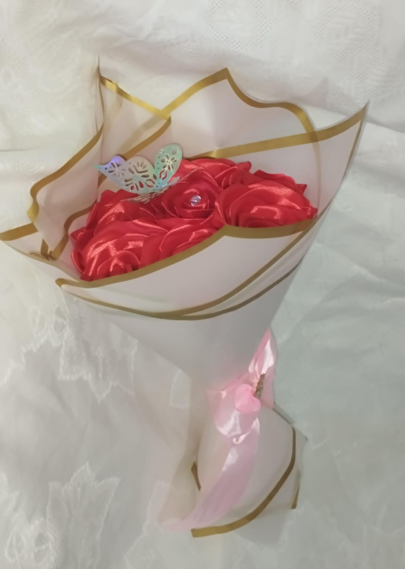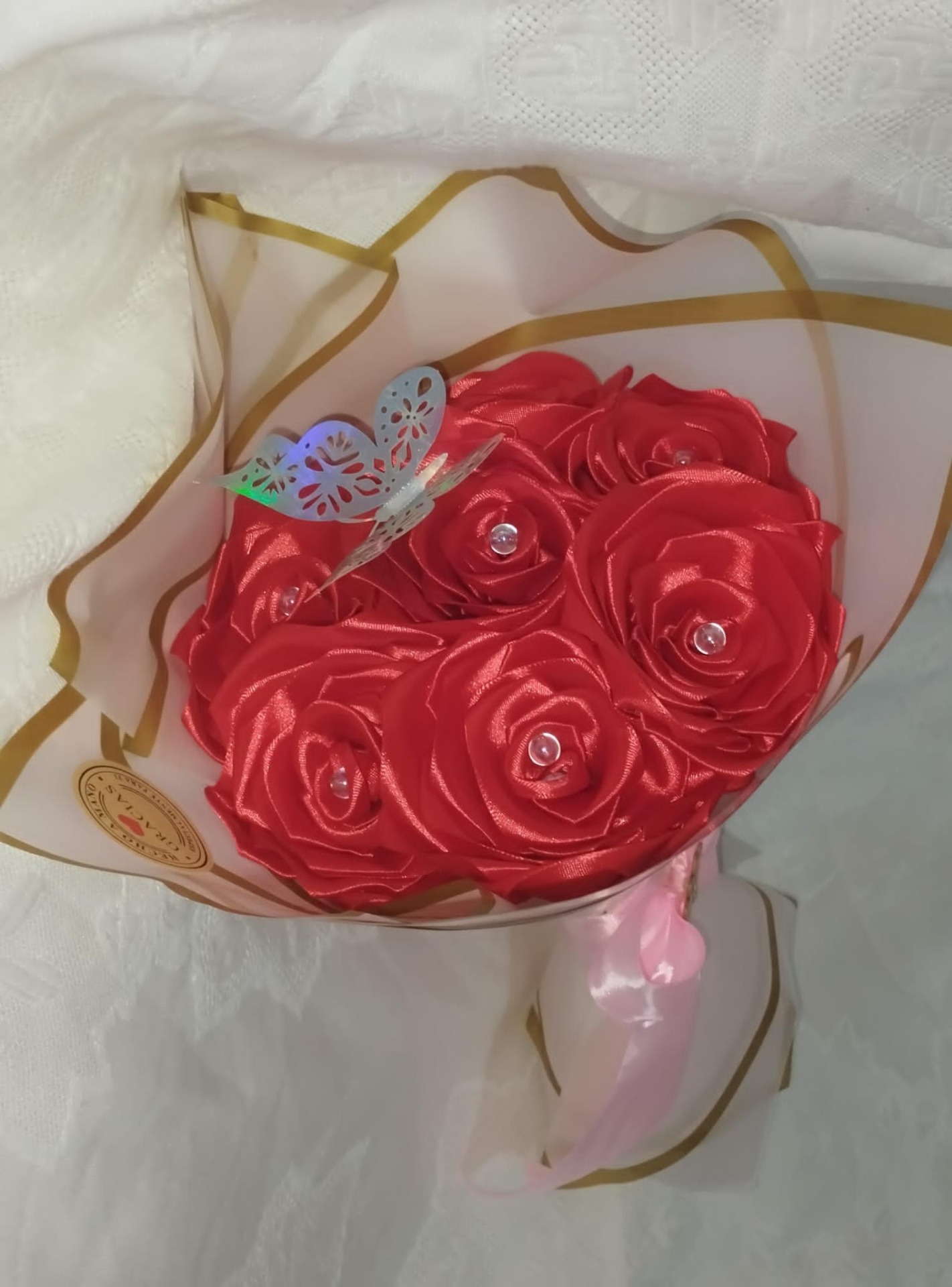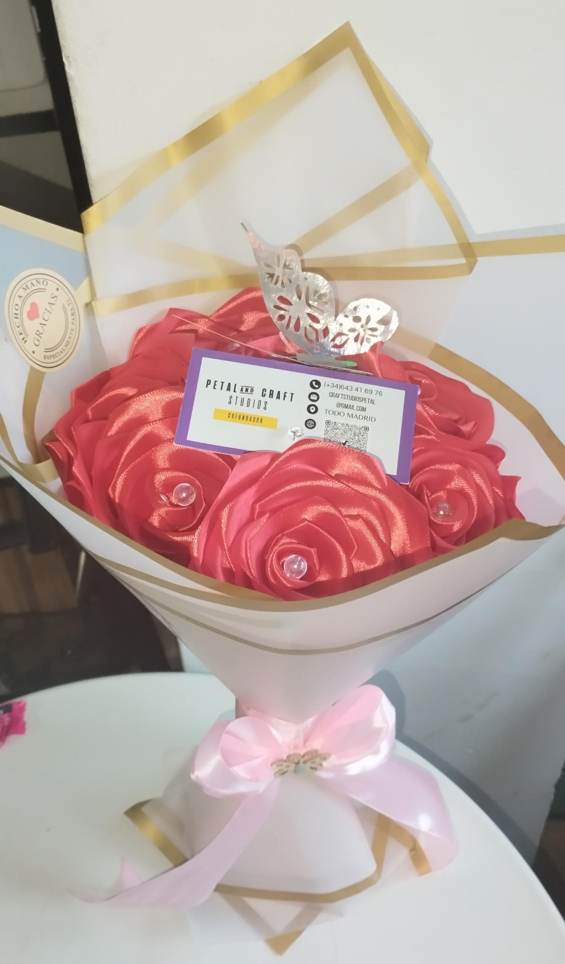 Un elegante ramo de rosas rojas de tela con detalles de perlas y una mariposa metálica que aporta un toque de sofisticación. Su diseño clásico y romántico lo convierte en el regalo perfecto para expresar amor y pasión en cualquier ocasión especial.