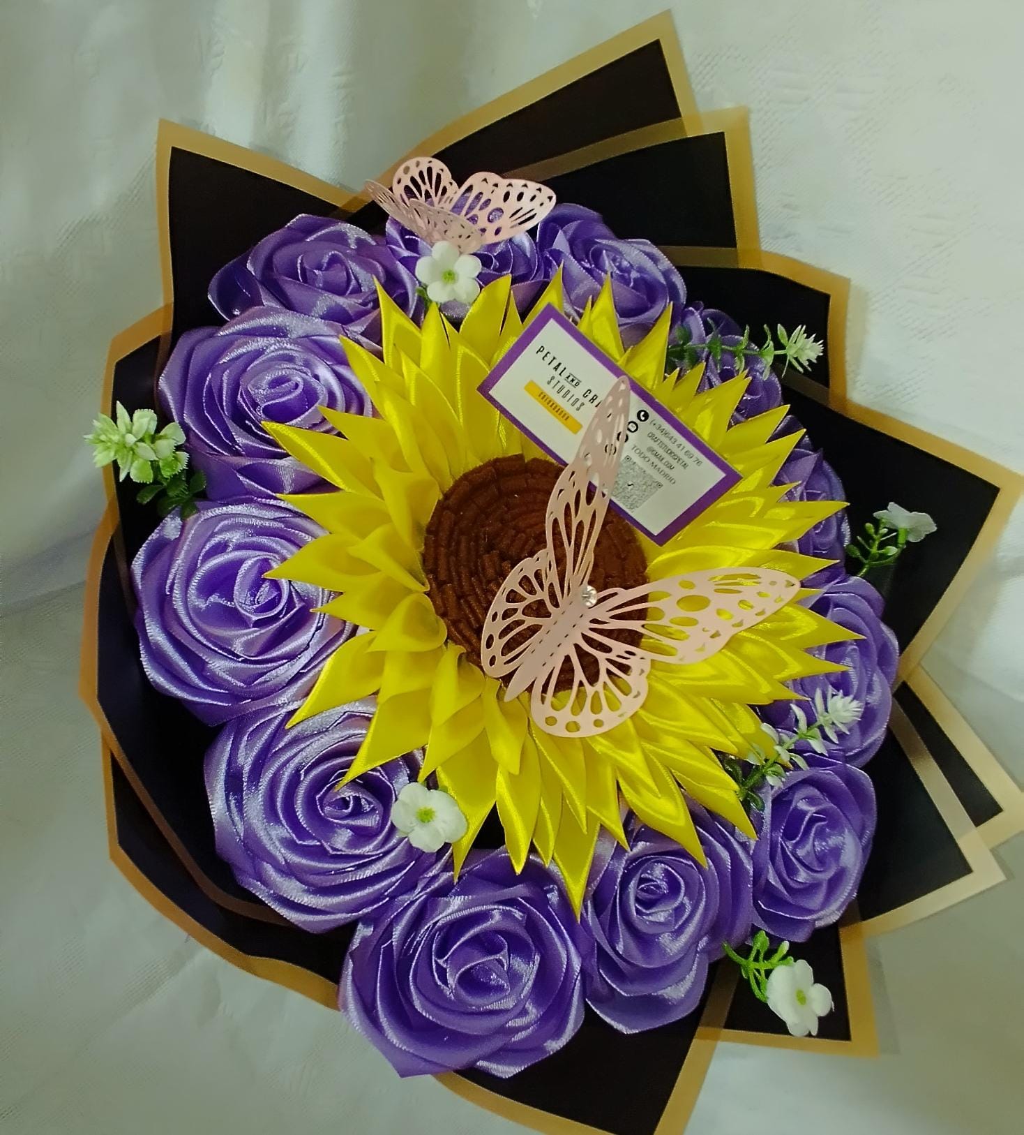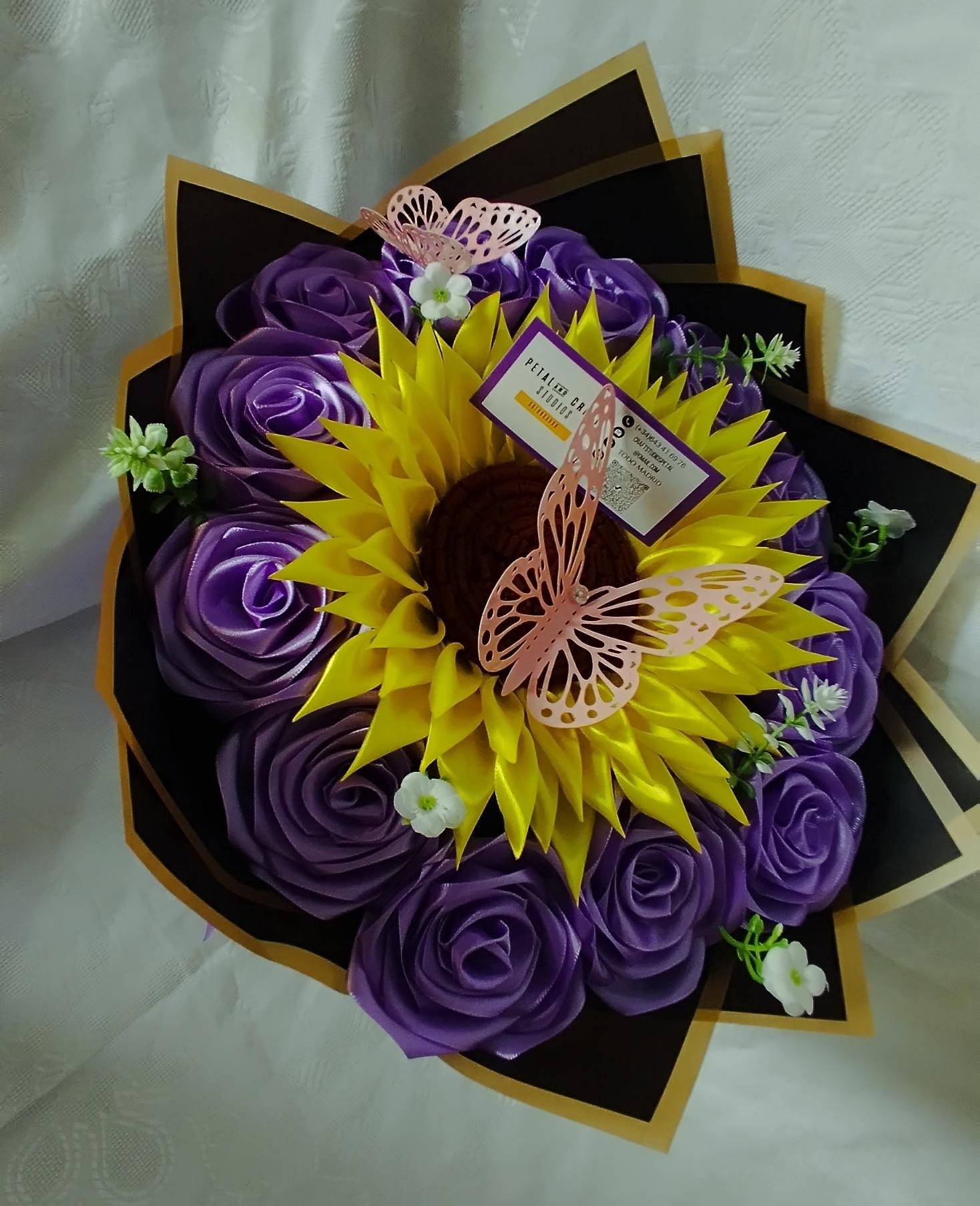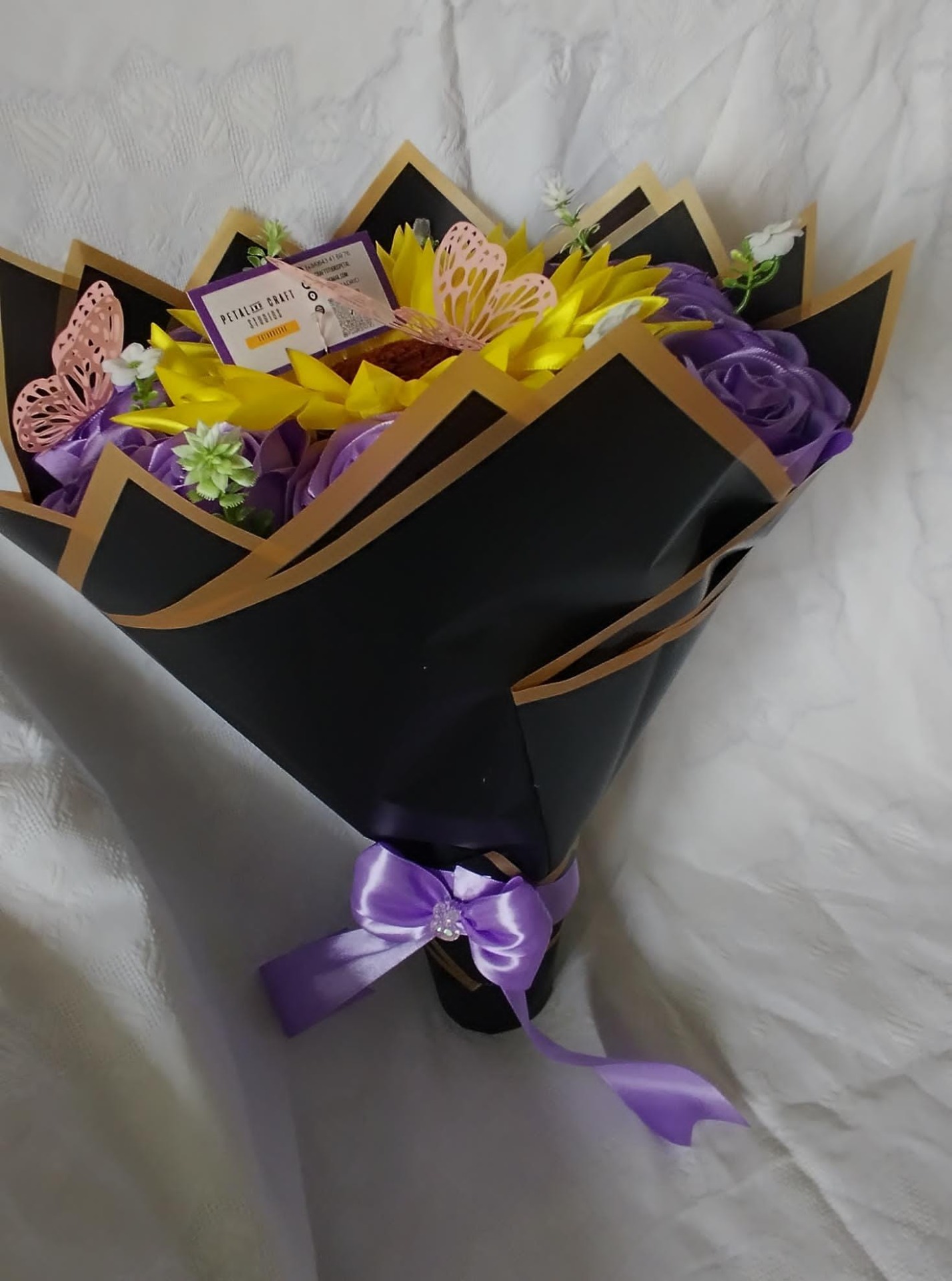 Precioso sol hecho de girasol que descansa sobre una cama de 12 flores moradas